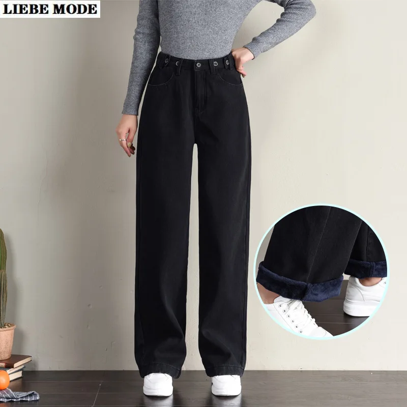 Женские флисовые теплые широкие свободные джинсы с высокой талией, женские зимние толстые бархатные черные прямые длинные джинсовые брюки с колокольчиком