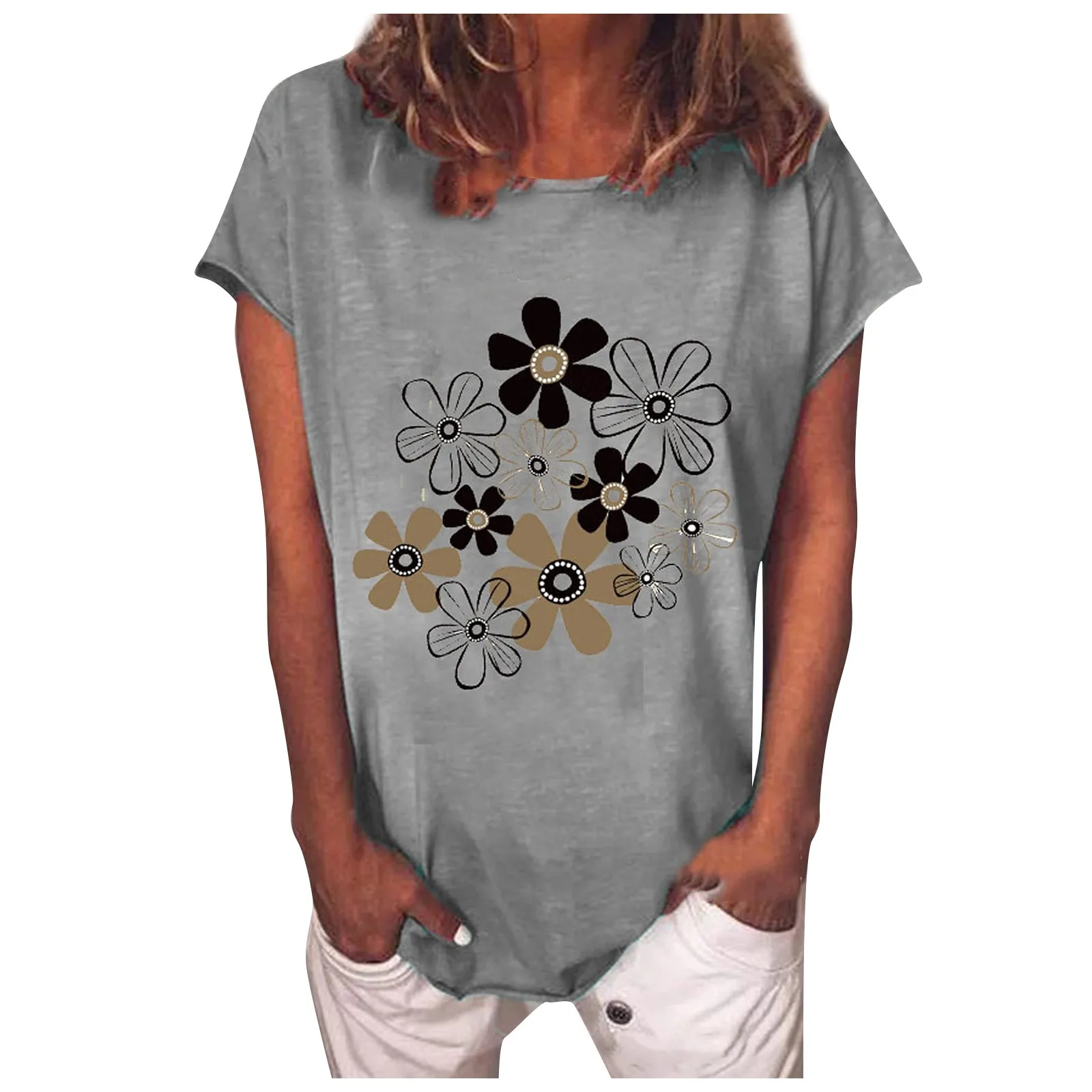Женские футболки с цветами, женская модная одежда с коротким рукавом, летняя рубашка, топы, футболка с круглым вырезом, женская футболка