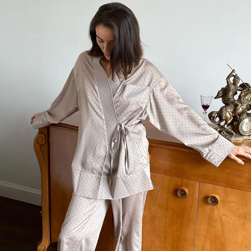 Женские халаты в горошек Restve, комплект из 2 предметов, свободный халат с длинным рукавом и карманами, женские комплекты на шнуровке с брюками...