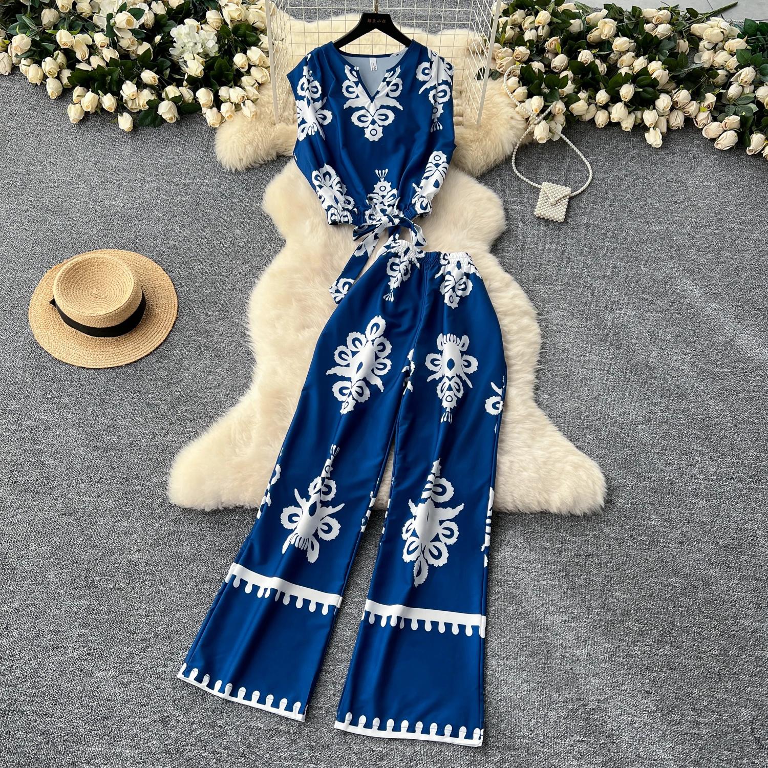 Женские шикарные комплекты из двух предметов, укороченный топ с v-образным вырезом, без рукавов, с принтом, базовые высокие брюки, модные летние комплекты One Size