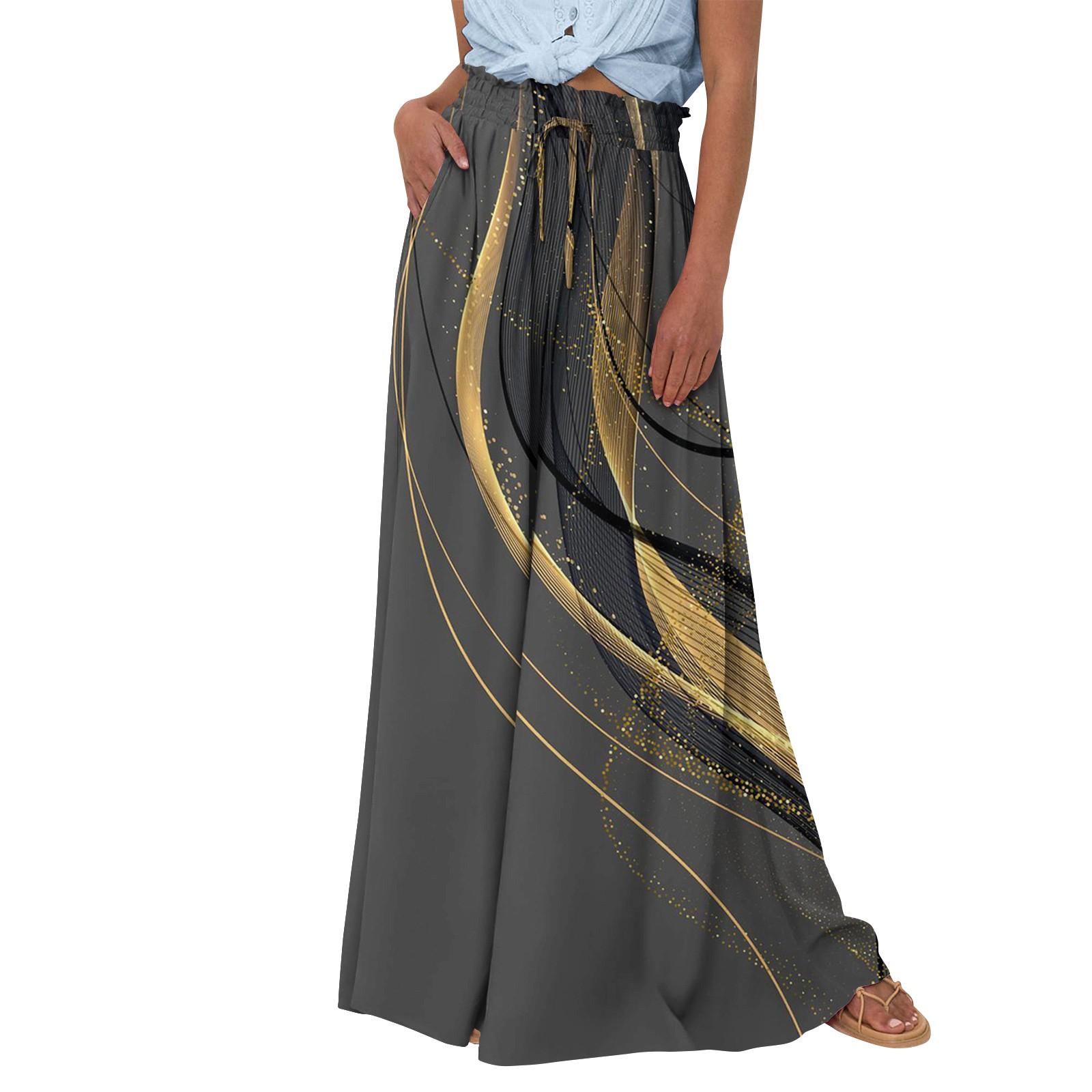 Женские широкие брюки с высокой талией, летние повседневные струящиеся брюки-палаццо, пляжные брюки с принтом и карманом XXL золотой