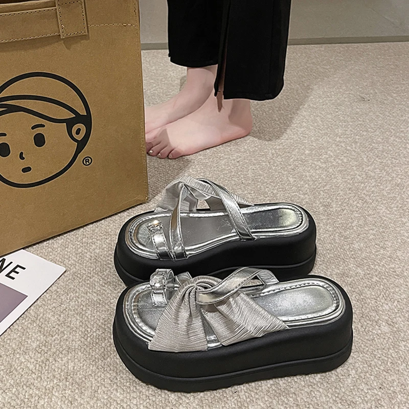 Женские шлепанцы на платформе, блестящие шлепанцы на каблуке, резиновые мюли, летняя обувь, 2023