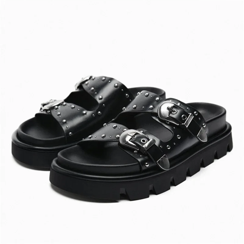 Женские шлепанцы с двойной пряжкой, повседневные сандалии на платформе, с заклепками, летняя пляжная обувь