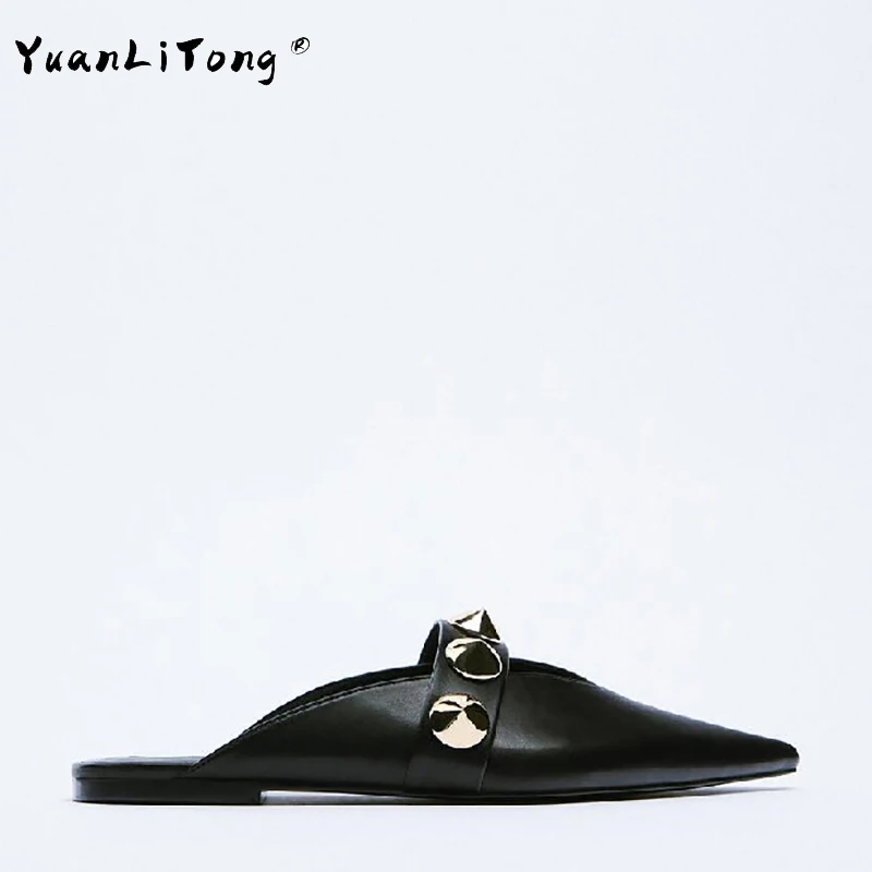 Женские шлепанцы с заклепками, заостренным носком, на плоской подошве