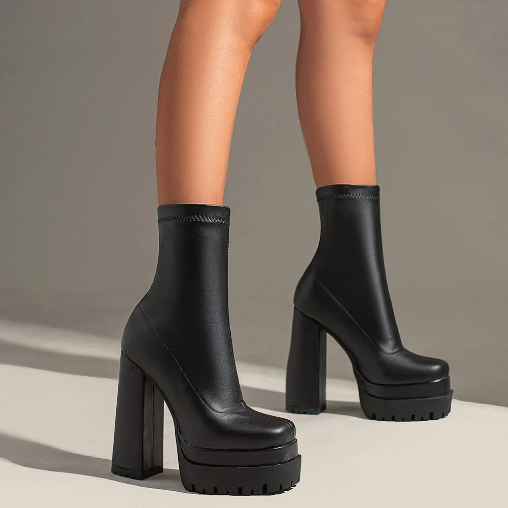 Женские эластичные ботинки на платформе, черные или белые вечерние ботинки на высоком блочном каблуке, 2023