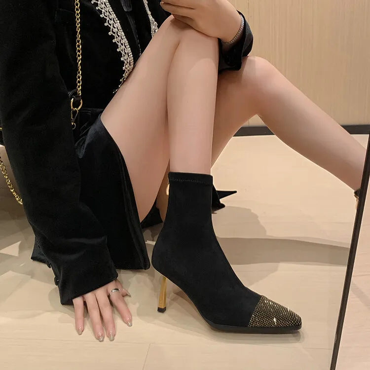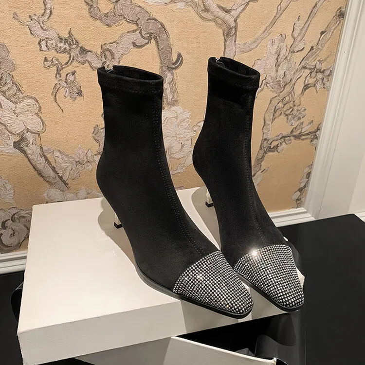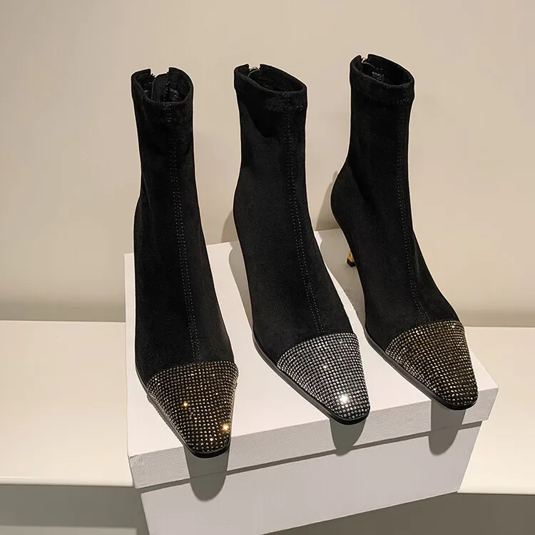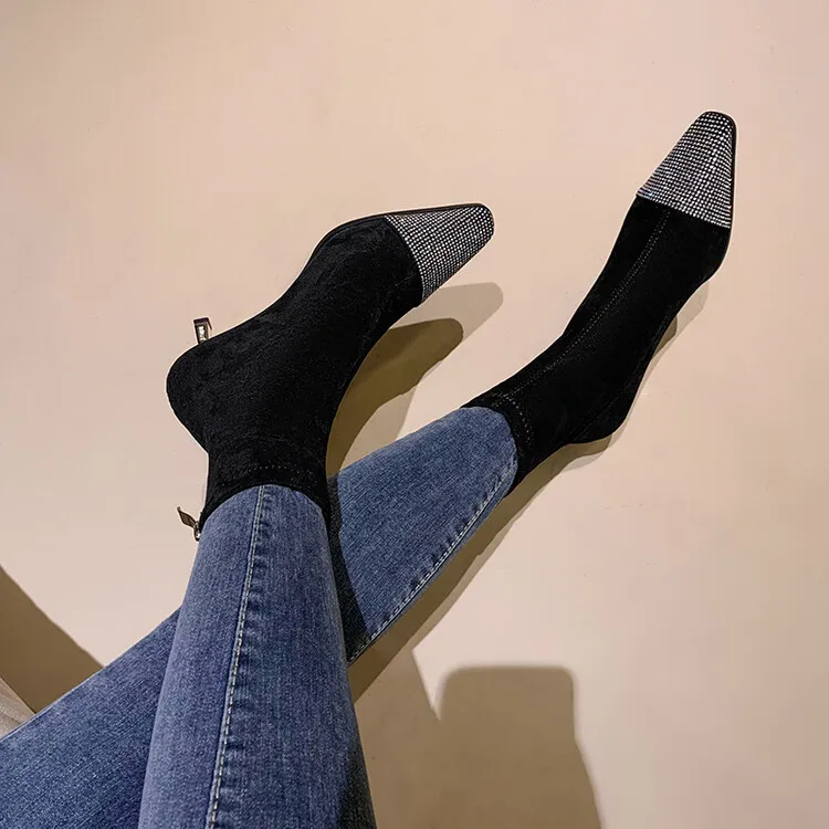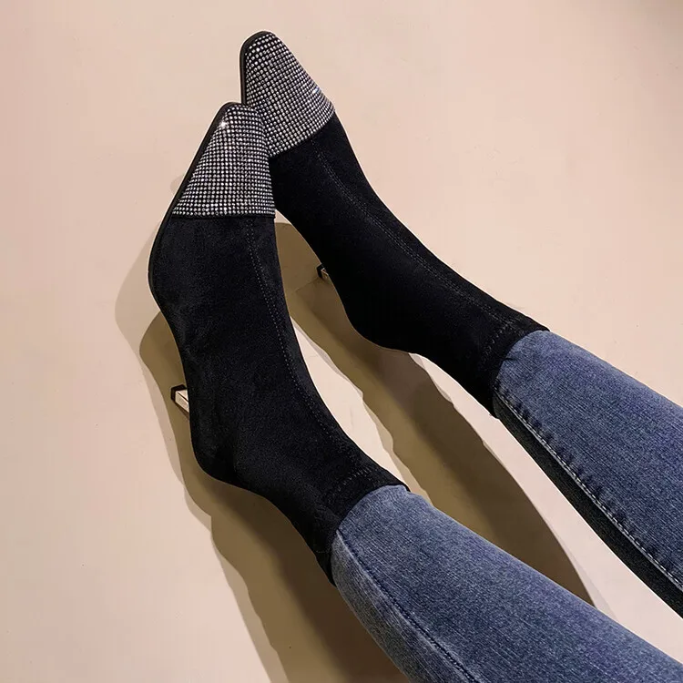 Женские эластичные ботинки-носки серебристого цвета с квадратным носком и кристаллами