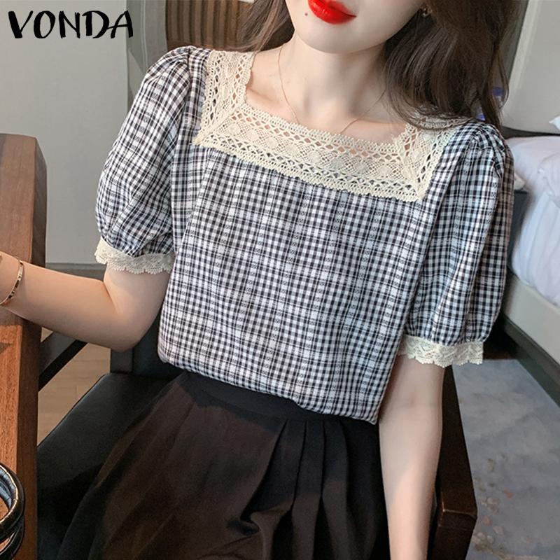 Женские элегантные топы VONDA с кружевной решеткой и пышными рукавами в клетку