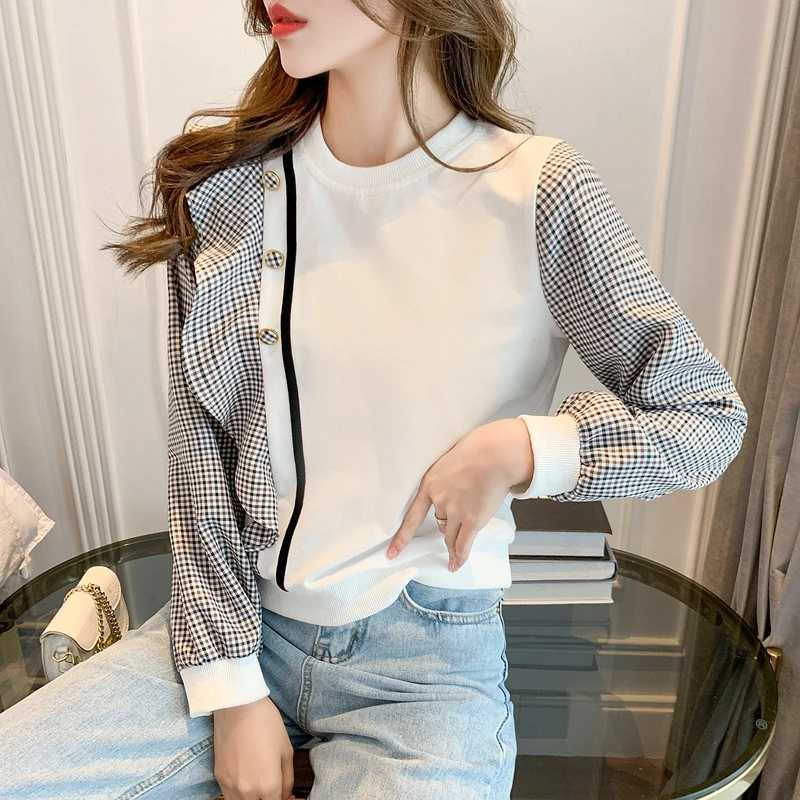 Женский Асимметричный Свитшот в клетку, с круглым вырезом и рукавами-фонариками