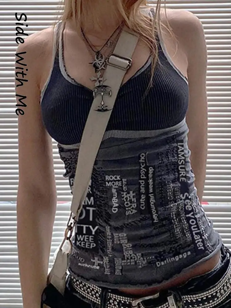 Женский Готический укороченный корсет Side with Me, Черная Женская майка с открытыми плечами и буквенным принтом, повседневные женские топы для ...