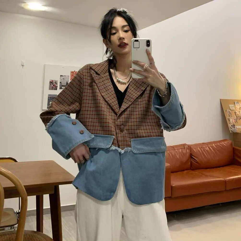 Женский Джинсовый блейзер в клетку, свободный Блейзер на одной пуговице, весна 2022