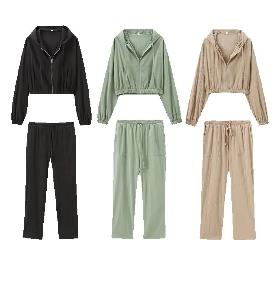 KONDALA Women Fall Sport Thin Short Jacket Suit Zipper Jacket with Hood and Elastic Waist Pants New 2024 Spring Summer Suit