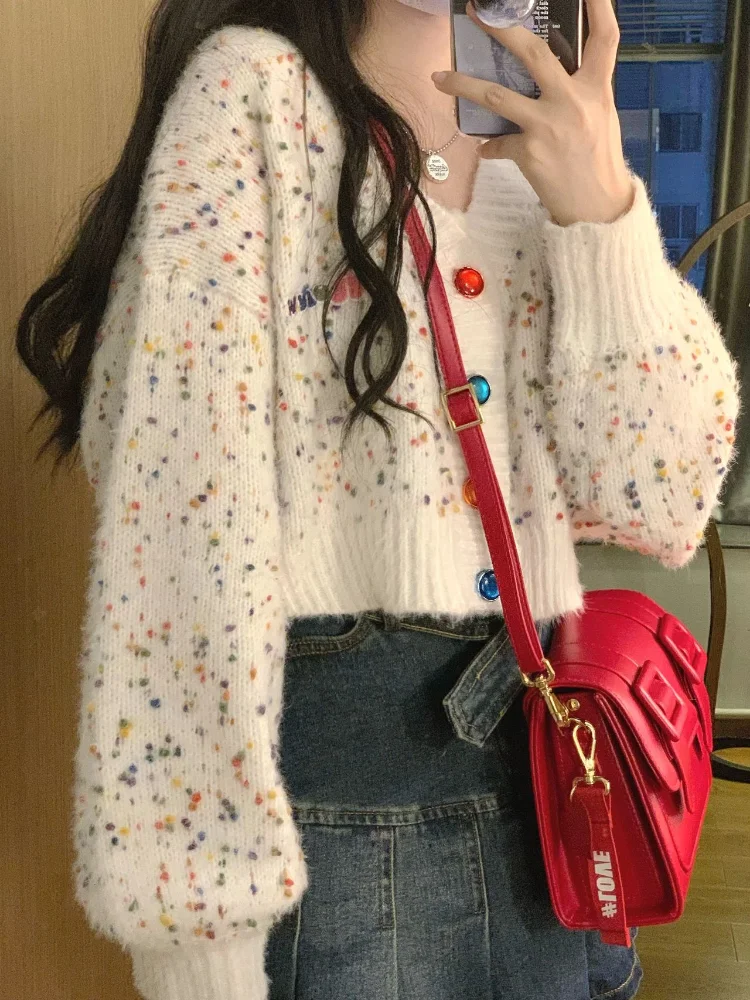 Женский Укороченный трикотажный кардиган в горошек, в Корейском стиле