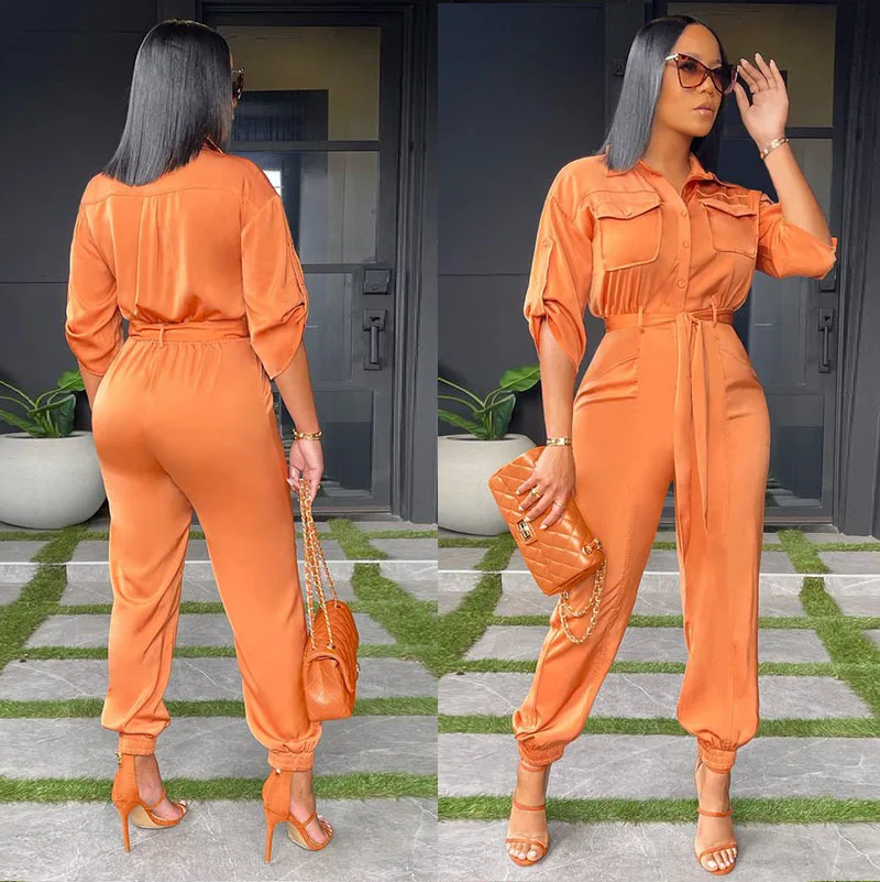 Женский атласный длинный комбинезон с поясом и длинным рукавом