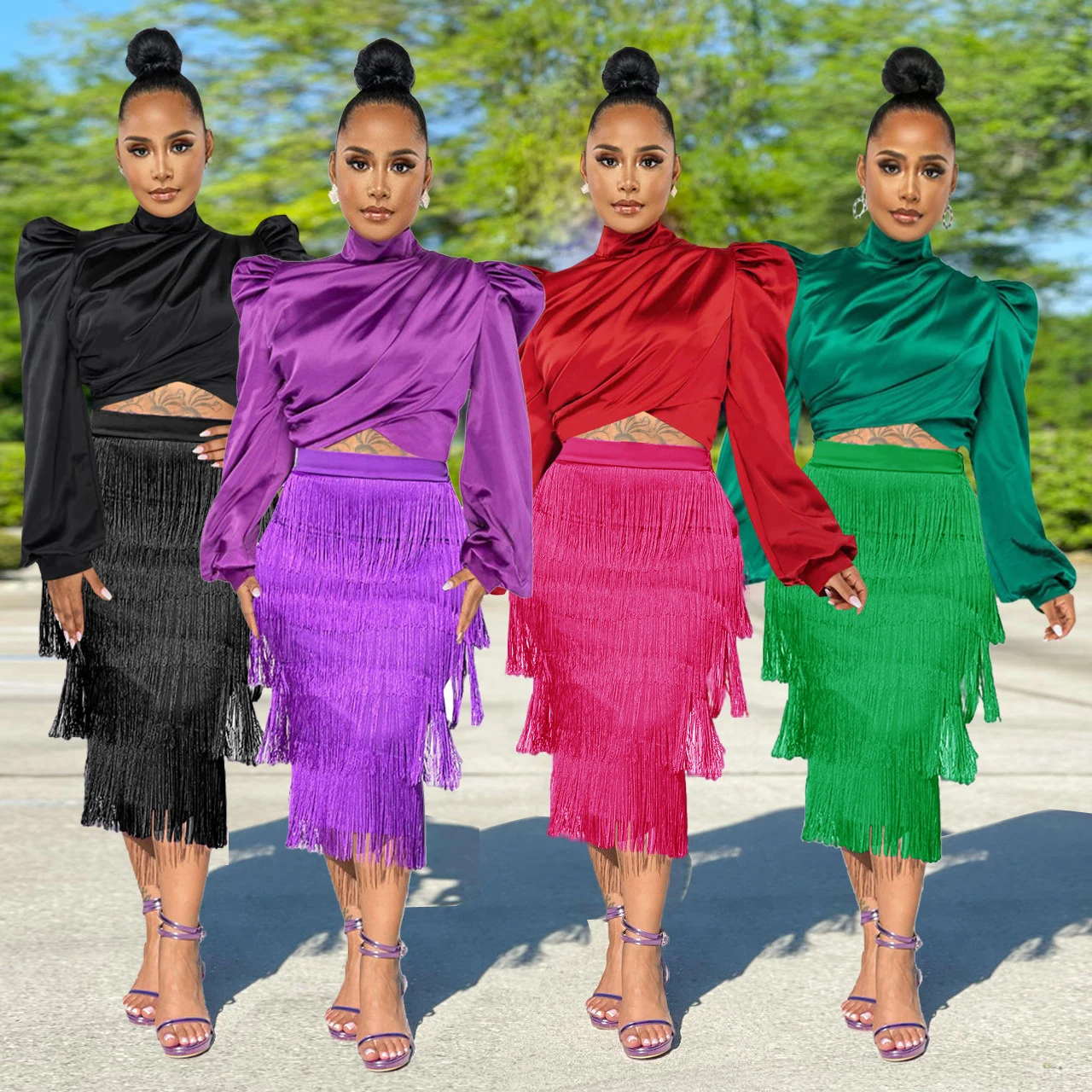 Женский атласный комплект из двух предметов, элегантный комплект из двух предметов с топом и юбкой с бахромой, Осень-зима 2022