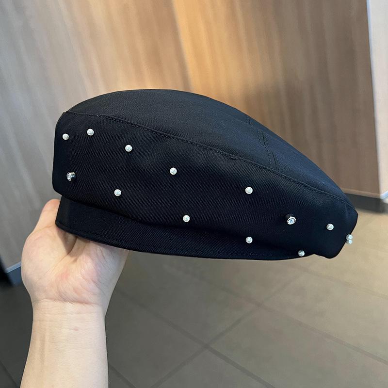 Женский берет со стразами и перламутром, модная весенне-осенняя универсальная шляпа с характером, японская ретро-шляпа с рисунком на лице 54-58cm чёрный