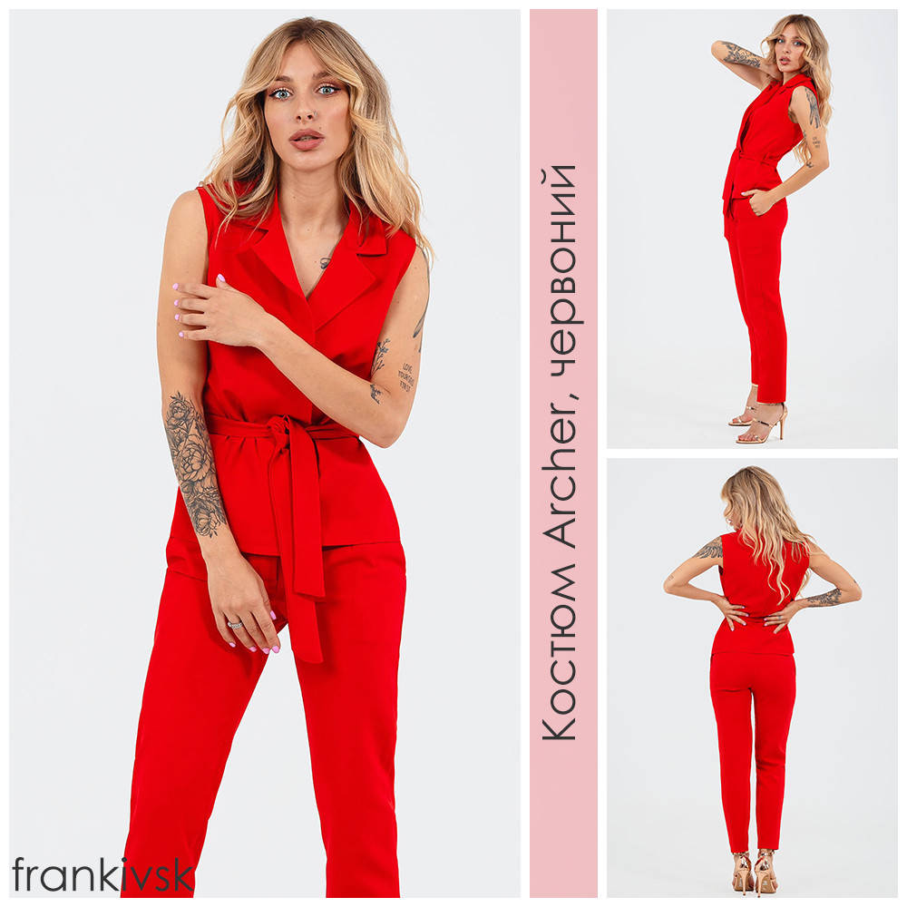 Стильный женский брючный костюм, выполненный из качественной креп-костюмкы. В комплект входит жилет, брюки и пояс.