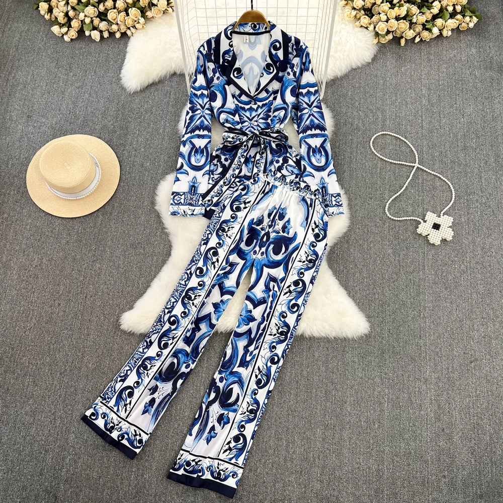 Женский брючный костюм с принтом Celadon, повседневный комплект из двух предметов, топ с воротником и высокой талией, прямые брюки с широкими штанинами