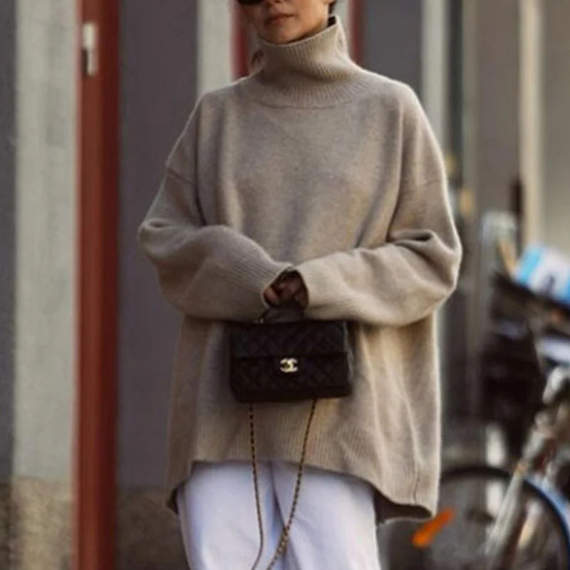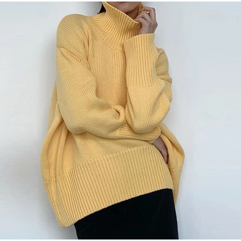 Женский винтажный Свитер оверсайз, длинный вязаный черный свитер с высоким воротником, Осень-зима 2021