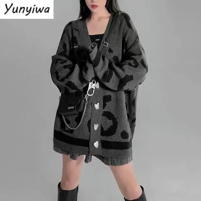 Женский винтажный кардиган с леопардовым принтом, свободная универсальная верхняя одежда в стиле Харадзюку, с длинным рукавом и V-образным вырезом, осень