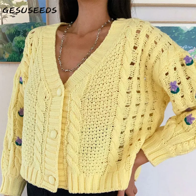 Женский винтажный кардиган с цветочной вышивкой, черный укороченный свитер с длинным рукавом и v-образным вырезом, желтый кардиган в Корейс...
