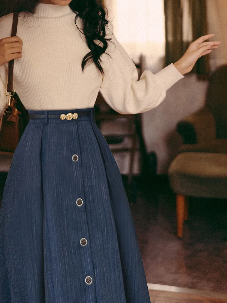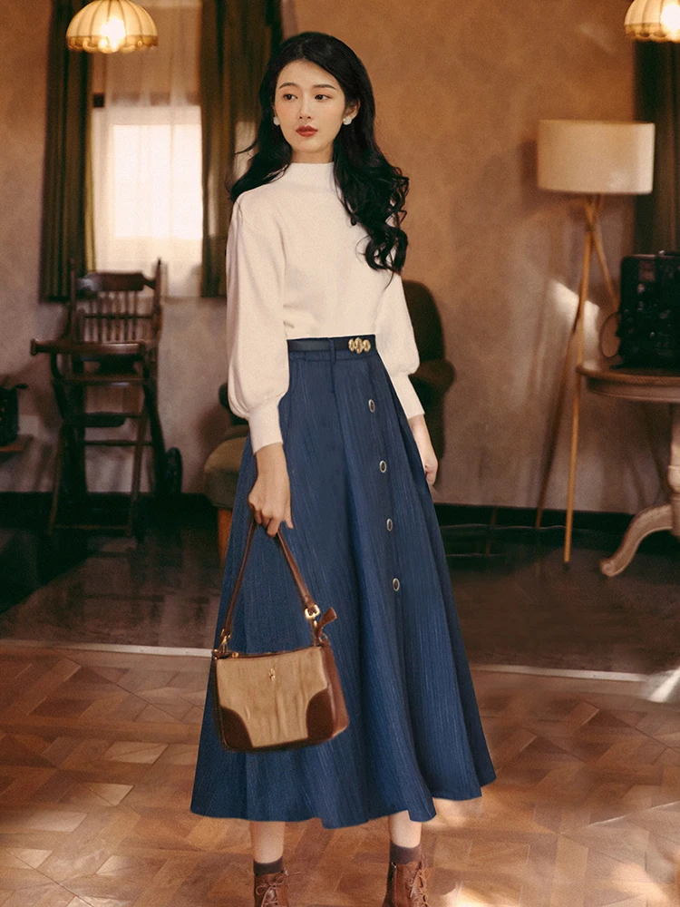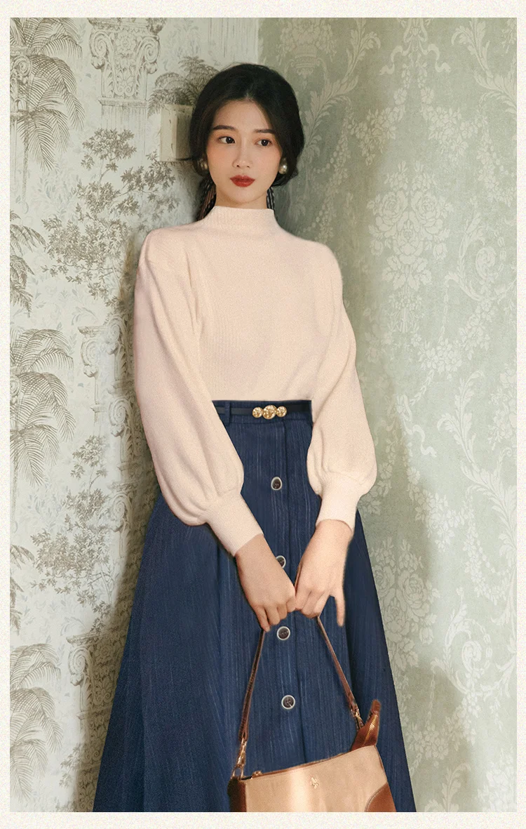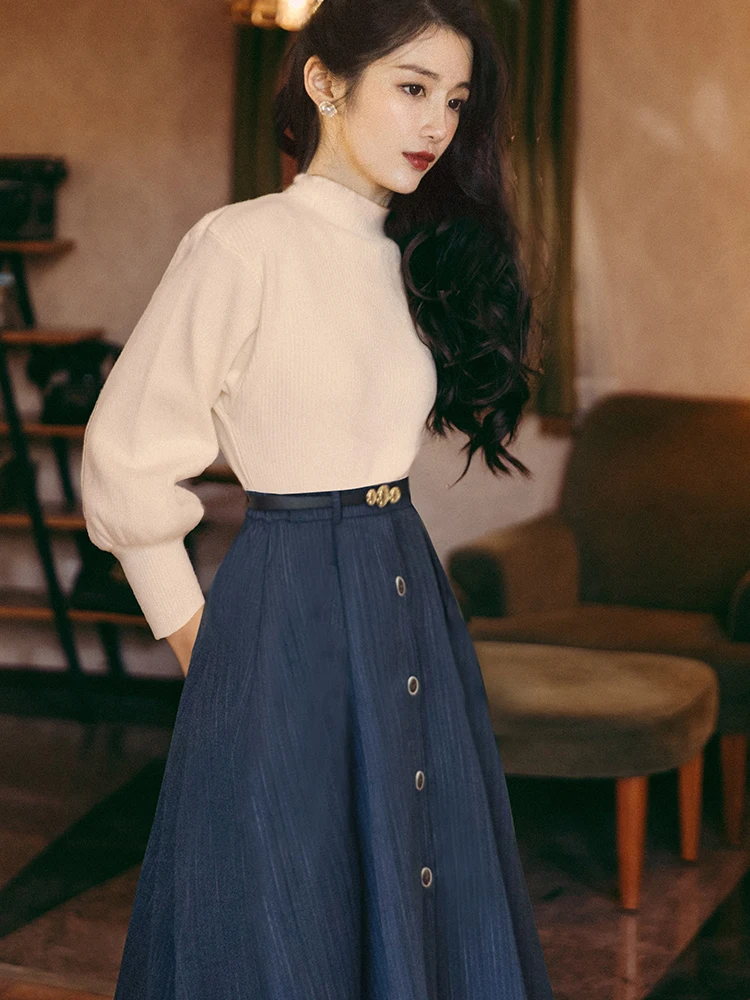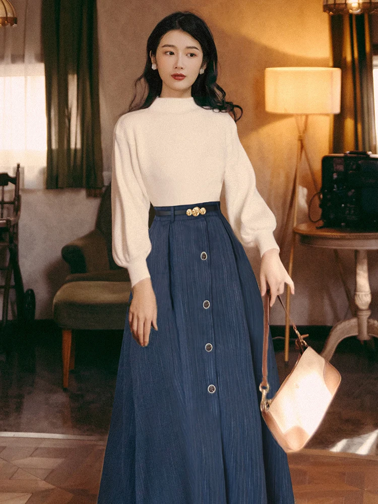 Женский винтажный комплект из двух предметов, свитер с рукавами-фонариками и юбка миди с поясом