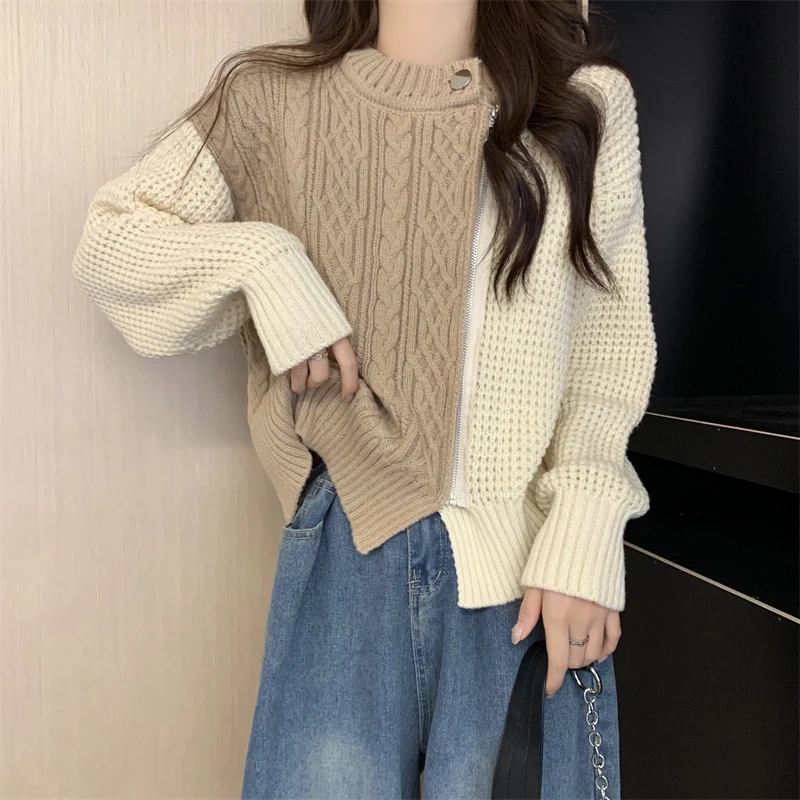 Женский винтажный свитер на молнии, повседневный Свободный вязаный пуловер с высоким воротником, джемпер в стиле пэчворк, Осень-зима, Y2K