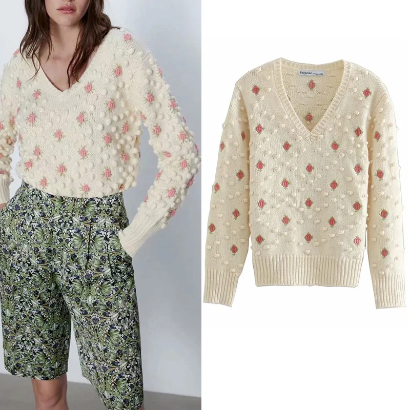 Женский винтажный свитер с V-образным вырезом и длинными рукавами