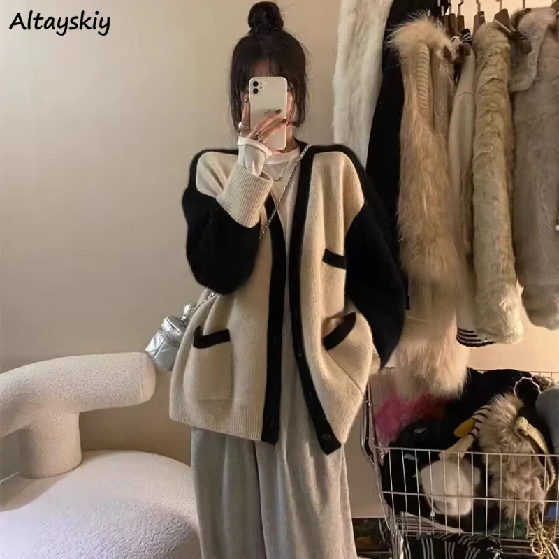 Женский вязаный кардиган в стиле преппи с карманами и V-образным вырезом