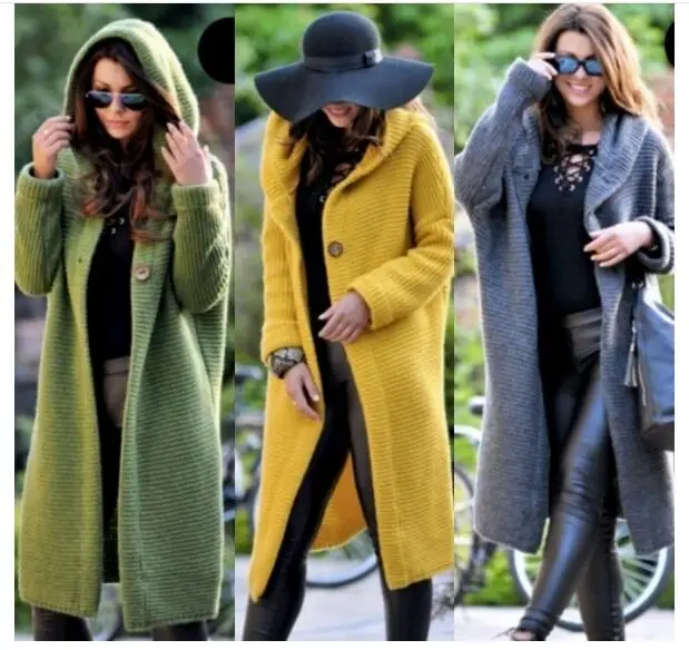 Женский вязаный кардиган с капюшоном, повседневный однотонный длинный свитер свободного покроя на пуговицах, кардиган размера 5XL, зима 2019