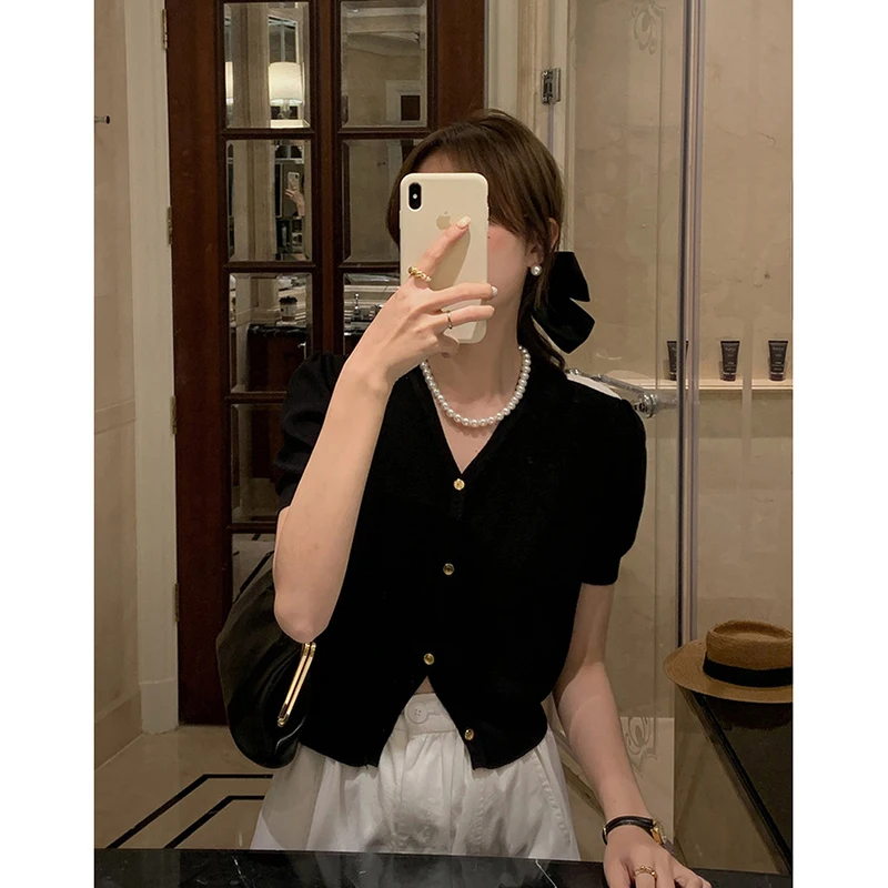 Женский вязаный кардиган с коротким рукавом, тонкий мягкий белый короткий топ с V-образным вырезом, короткий топ во французском стиле, лето 2023
