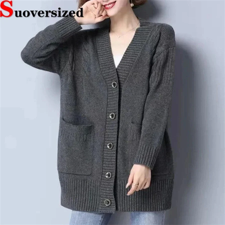 Женский вязаный кардиган с V-образным вырезом, средней длины
