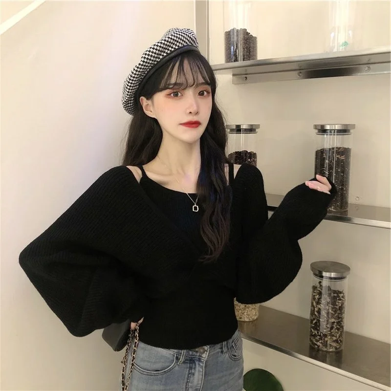 Женский вязаный кардиган, черный вязаный кардиган с имитацией двух предметов, Осень-зима 2020