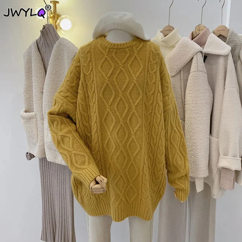 Женский вязаный пуловер средней длины с круглым вырезом и длинными рукавами