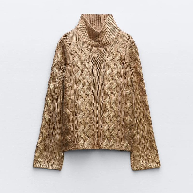 Женский вязаный свитер с длинным рукавом, свободный Однотонный свитер с высоким воротником и принтом из металлической фольги, весна-осень