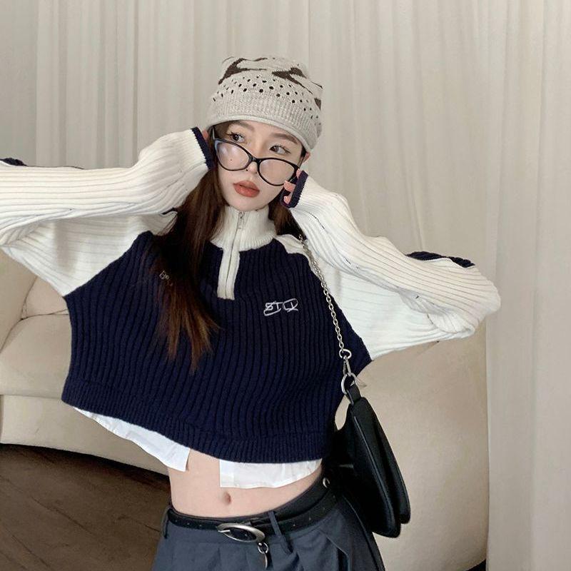 Женский вязаный свитер 2025 года с цветными блоками: Воротник-стойка, застежка-молния до середины, длинный рукав One Size темно-синий