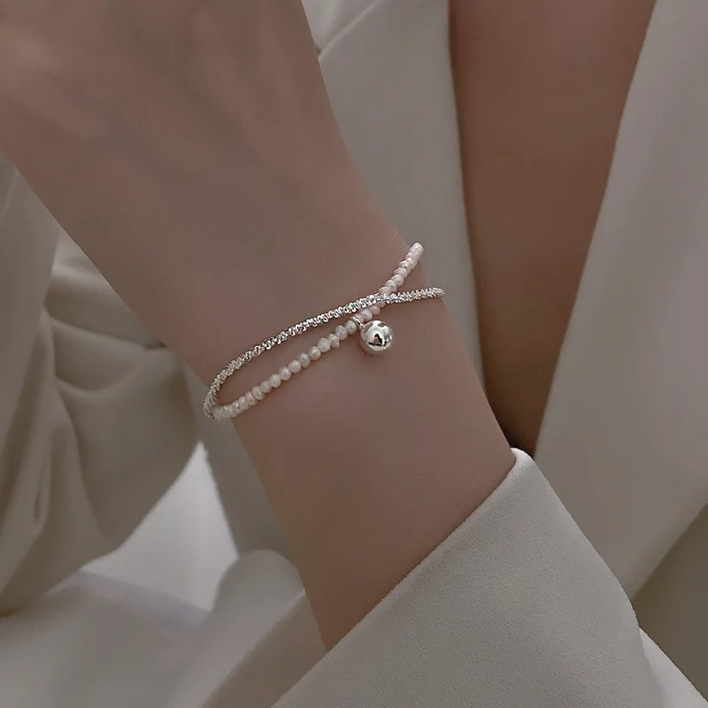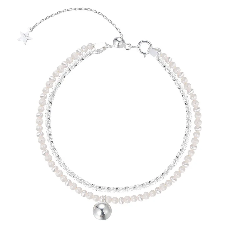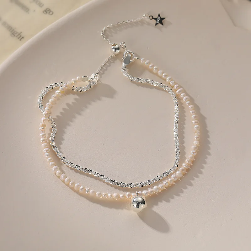 Женский двухслойный браслет из серебра пробы с жемчугом Гипсофила