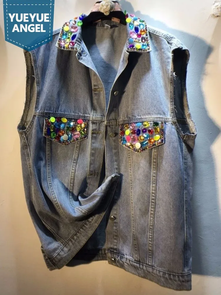 Женский джинсовый жилет с кристаллами, свободная повседневная безрукавка с отложным воротником