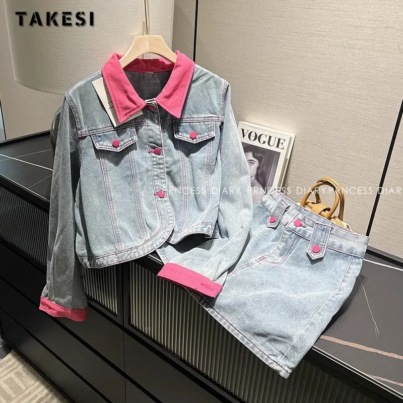 Женский джинсовый костюм из двух предметов, повседневная куртка с длинным рукавом и юбка-футляр в Корейском стиле, короткие юбки Y2K, осень 2023