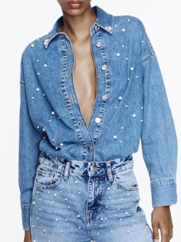 Женский джинсовый топ с искусственным жемчугом, свободного покроя