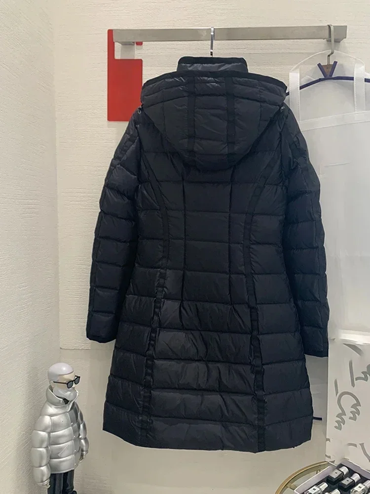 Женский длинный пуховик с капюшоном, черная зимняя куртка на утином пуху с надписью, Y2K