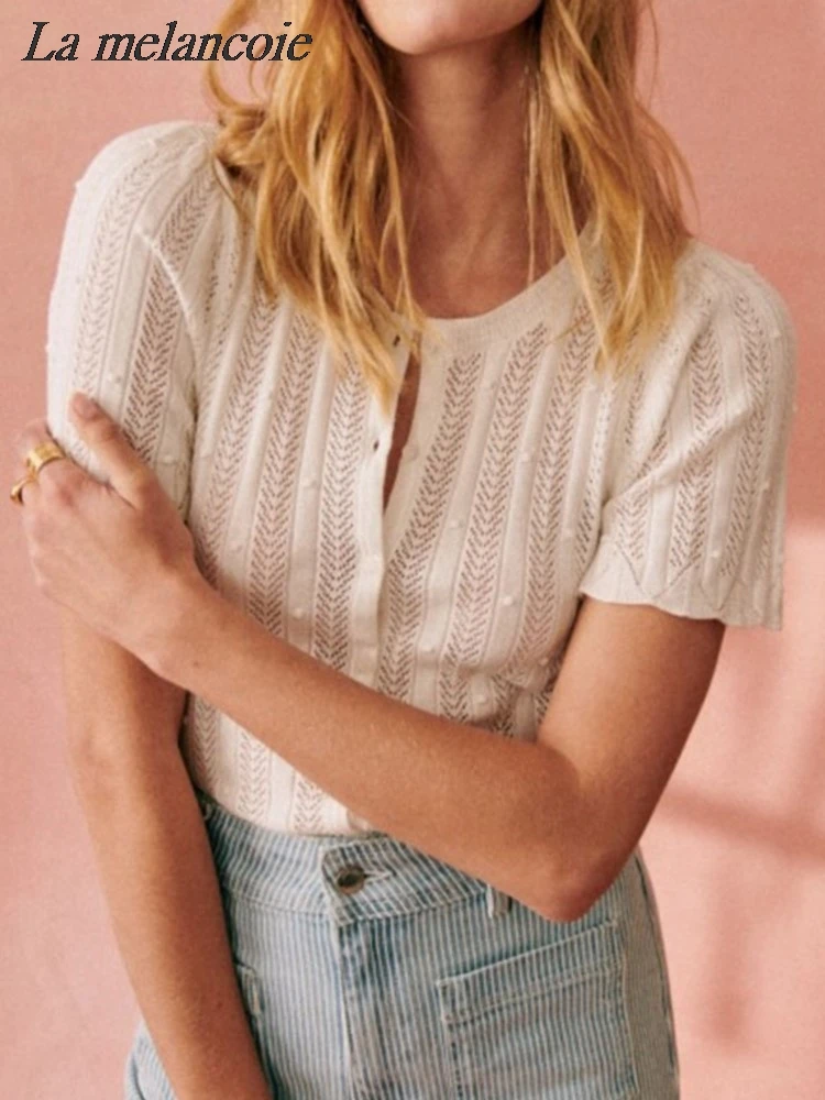 Женский жаккардовый кардиган, элегантный вязаный жаккардовый топ с пуговицами и рукавами-фонариками, винтажная трикотажная одежда, лето 2024