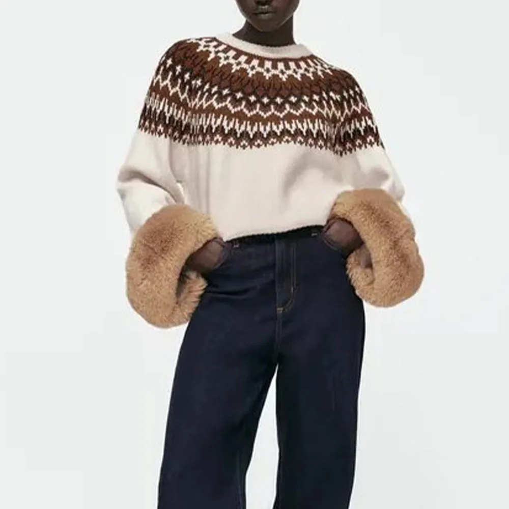 Женский жаккардовый свитер Za, винтажный пуловер с искусственным мехом и круглым вырезом, зима 2021