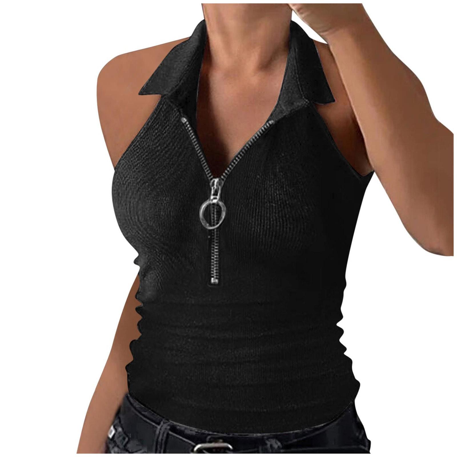 Женский жилет с воротником, летняя майка, ребристая, на половину молнии, с V-образным вырезом, тонкая укороченная рубашка без рукавов XXXXL чёрный