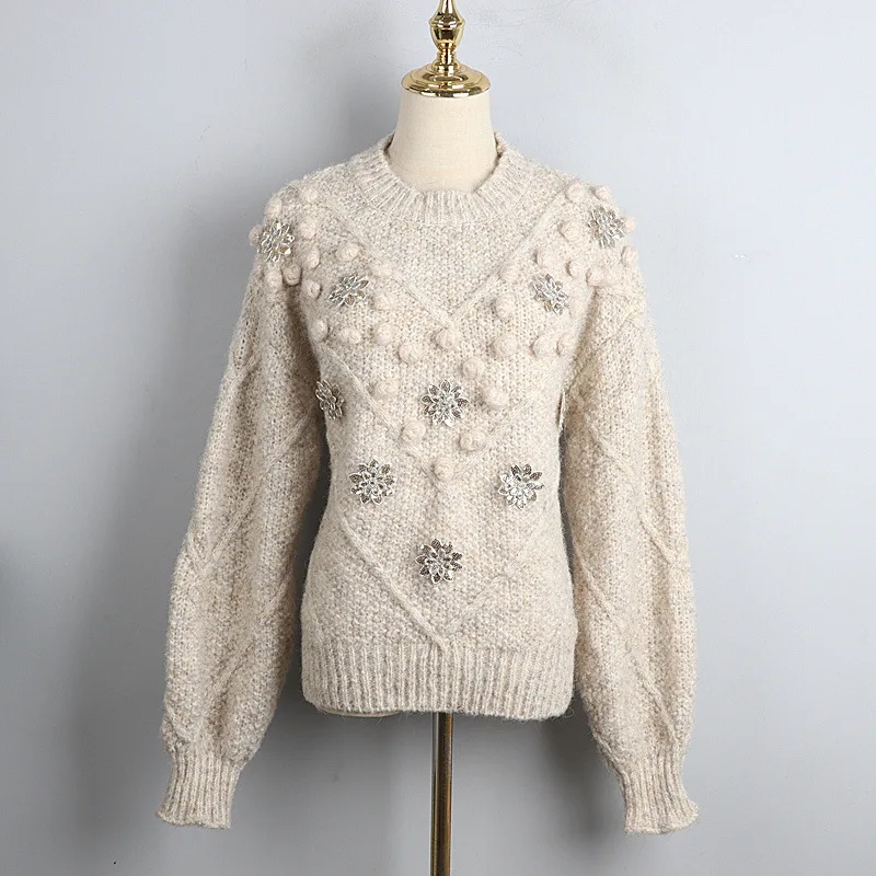 Женский зимний свитер ручной работы с цветочной вышивкой, шикарная вязаная куртка с круглым вырезом и жемчугом, зимняя одежда для женщин