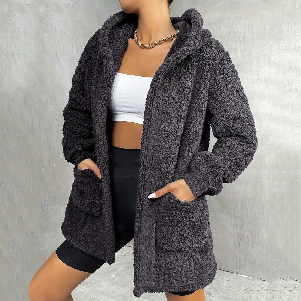 Женский кардиган средней длины, осенне-зимний Кардиган с капюшоном и длинным рукавом, плюшевое пальто, однотонная Свободная Повседневная Верхняя одежда с открытым спереди
