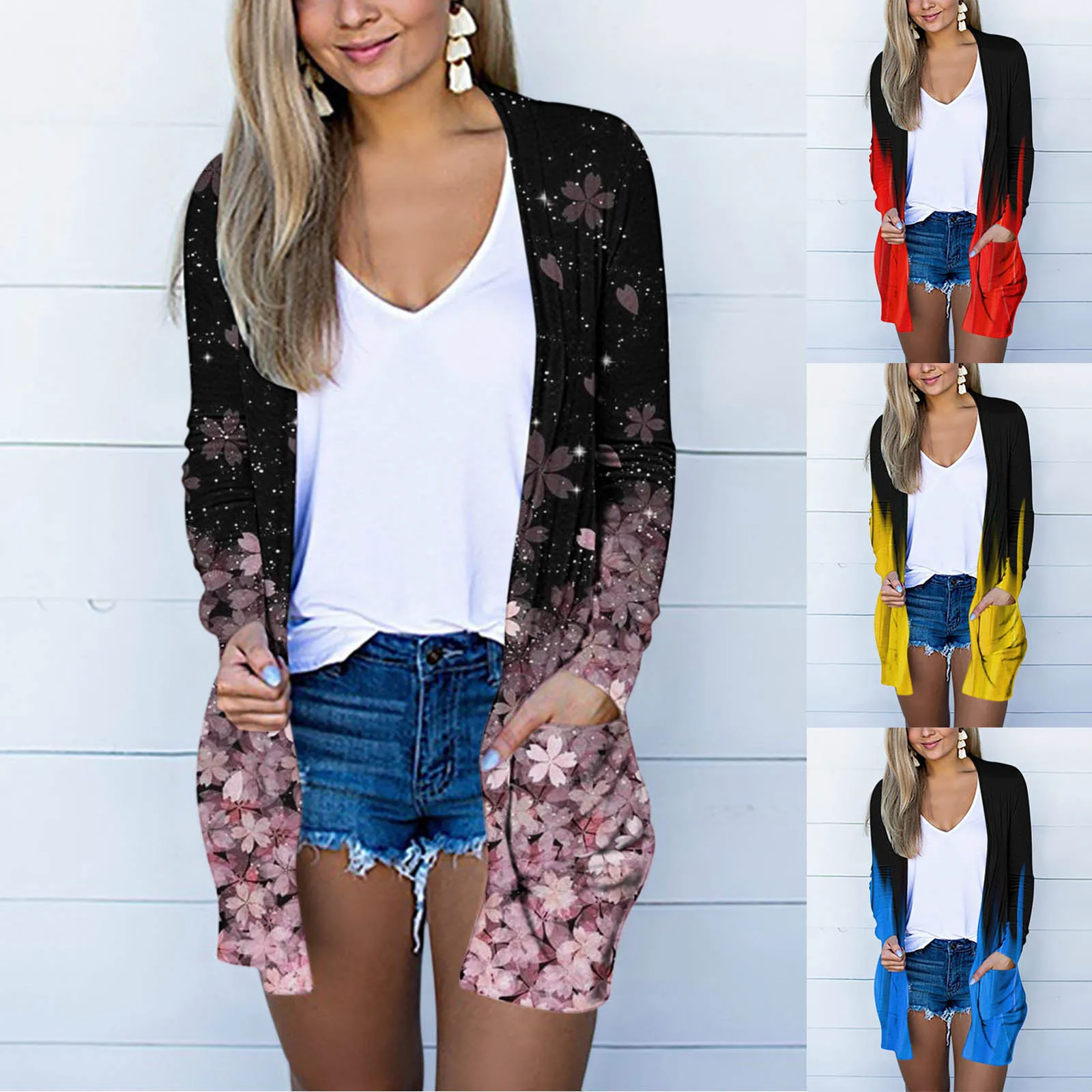 Женский кардиган с принтом пламени, повседневный Свободный кардиган средней длины с длинными рукавами и карманами, верхняя одежда для дево...