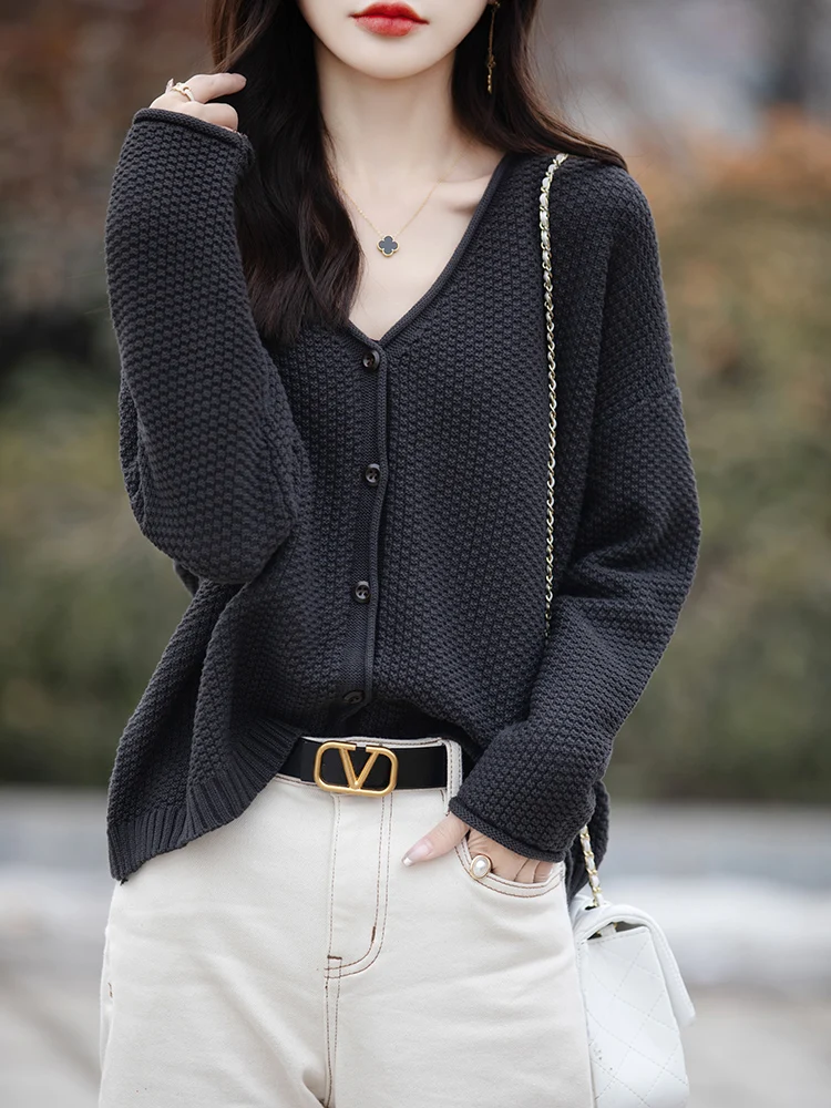 2024 Spring/Autumn New 100% Cotton Cardigan Sweater Women V-neck Solid Color Long Sleeve Jacket Korean Fashion Loose Coat Female