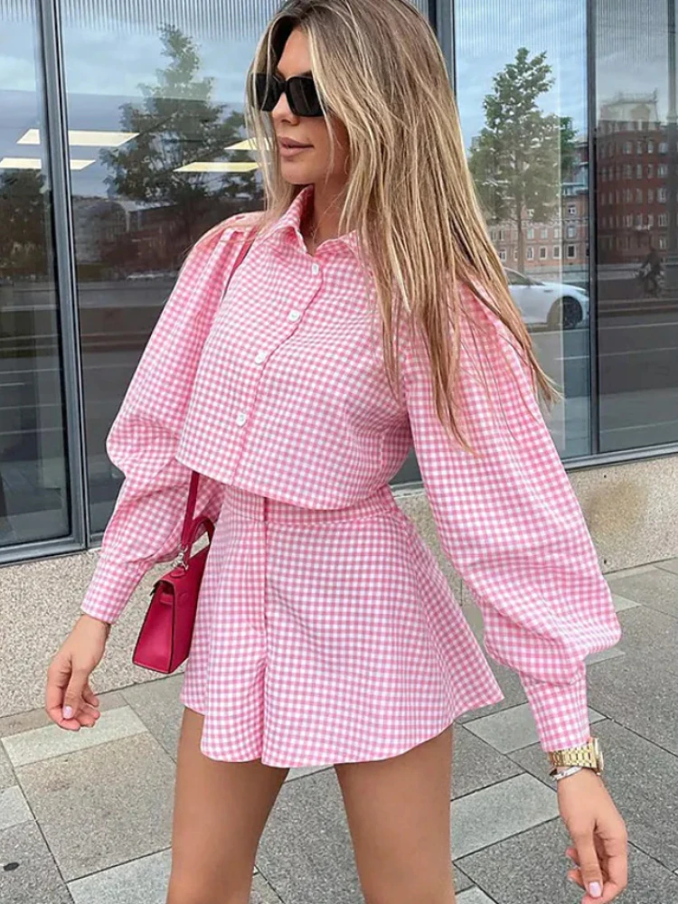 Женский клетчатый комплект из двух предметов, летний комплект из рубашки с пышным рукавом и шортов с широкими штанинами, шикарный комплект из двух предметов, женский костюм