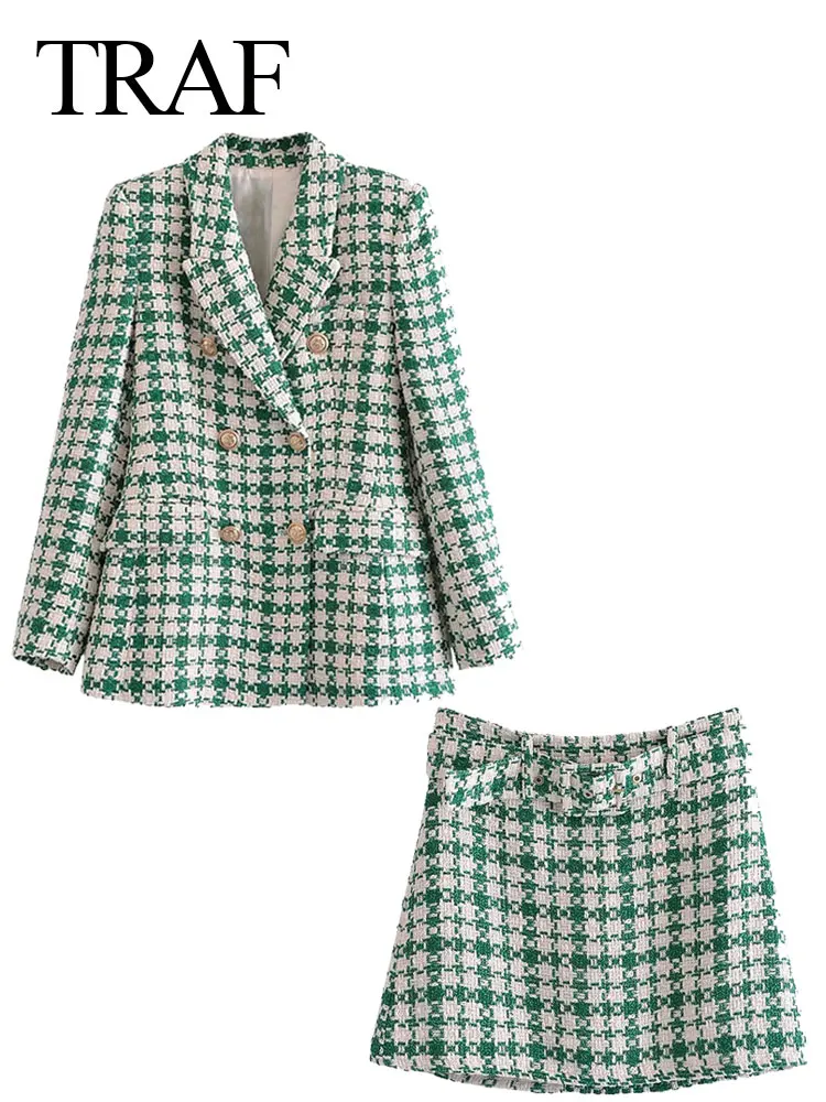 Женский клетчатый текстурный костюм WESAY JESI, двубортный блейзер с длинным рукавом и облегающая юбка, Элегантная Дамская уличная одежда