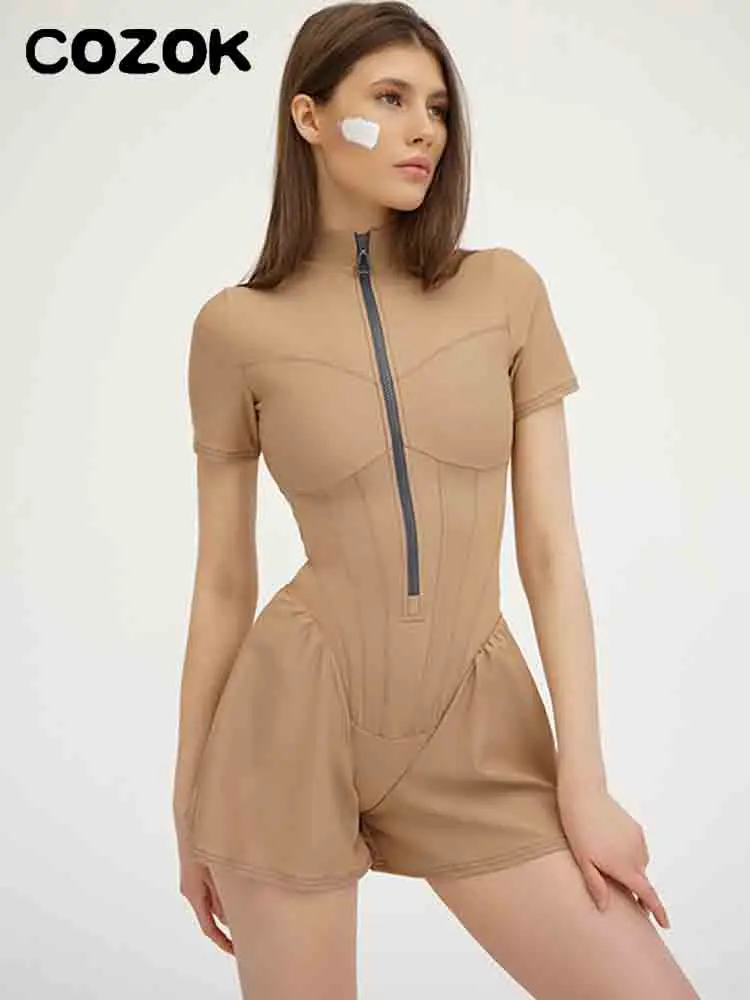 Женский комбинезон на молнии с коротким рукавом, с широкими штанинами